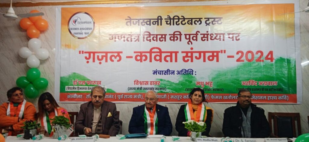 देहरादून। तेजस्विनी चैरिटेबल ट्रस्ट की ओर से गणतंत्र दिवस की पूर्व संध्या पर कविता शायरी संगम कार्यक्रम का आयोजन इंदौर रोड स्थित तस्मिया हाल में किया गया जिसमें कवियों व शायरों ने कविता एवं शायरी पाठ किया।
